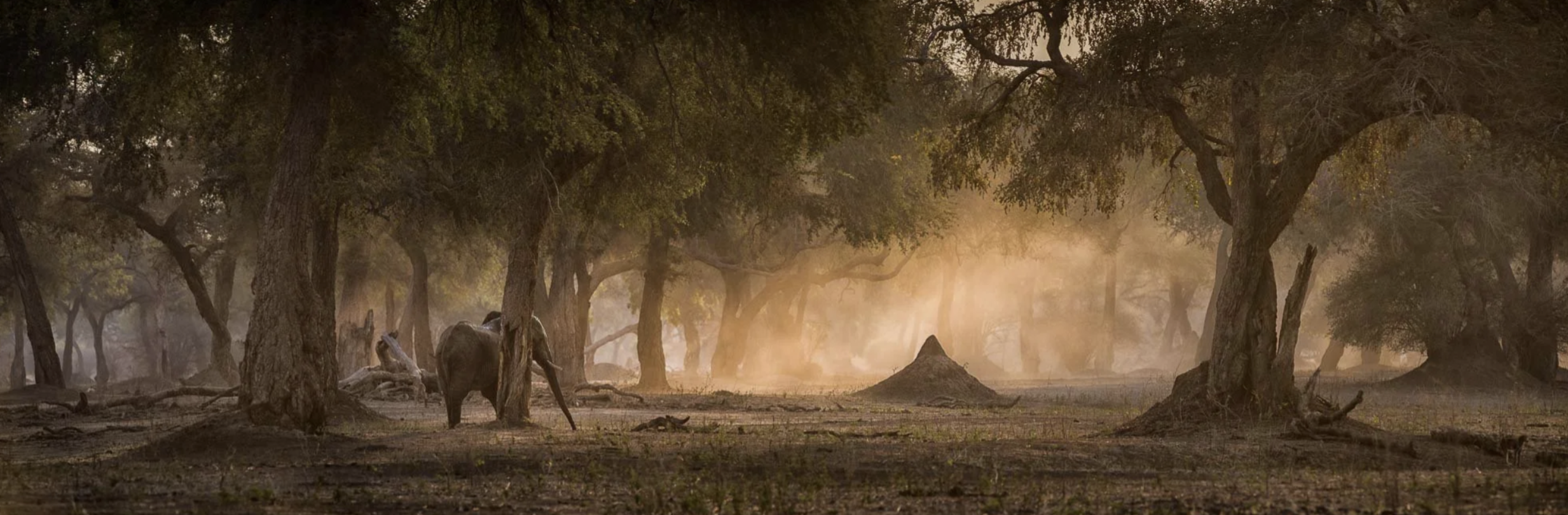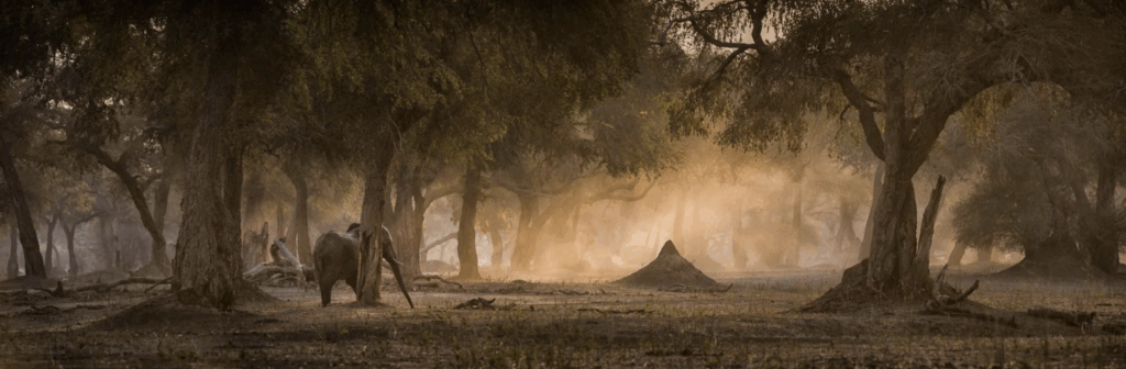 The focus of our photography will be evocative and atmospheric shots – at sunrise and sunset when dust hangs in the light and elephants move ghostlike through the forest, framed in shafts of light and dust.