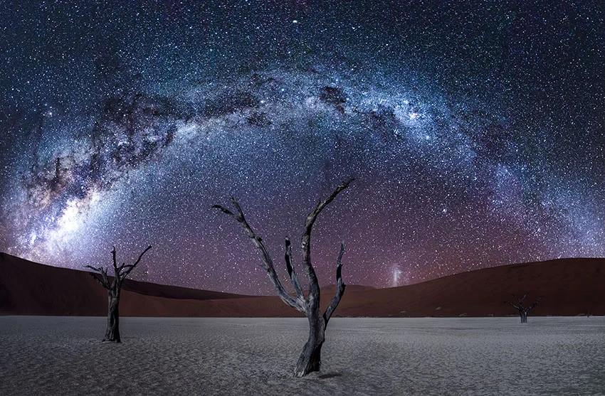 We continue our journey south towards the towering dunes of Sossusvlei, a surreal desert landscape that shifts with the light. Early mornings bring us to Dune 45 and Deadvlei, where skeletal trees stand stark against the white clay pan and fiery-red dunes. We capture the silhouettes of oryx moving gracefully across the sand, chasing the golden light that defines this otherworldly terrain.